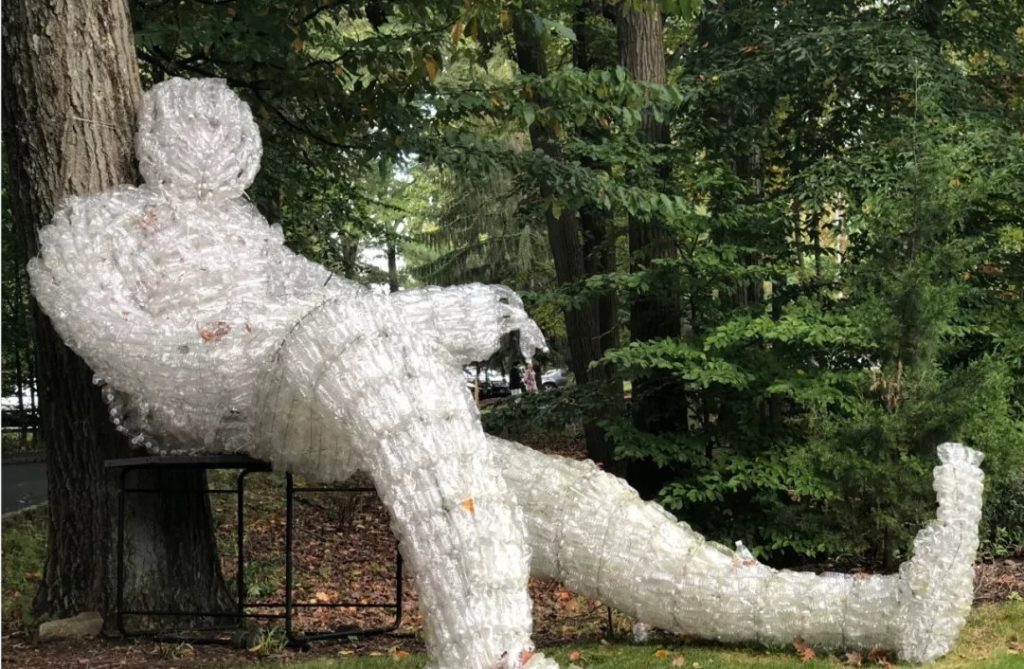就在刚要走进校门的时候,看到了一个巨大的人像艺术作品。仔细一看,竟然是用空的矿泉水瓶扎成的。后来,学校工作人员告诉这是号召学生们养成自带水瓶的习惯,不要买瓶装矿泉水。想起了两年前,在Horace Mann访校时看到他们学生做的矿泉水窗帘(Horace Mann访校--山顶上的百年顶级私校)。垃圾和艺术,就这样被有创意的学生们和谐的结合起来了。